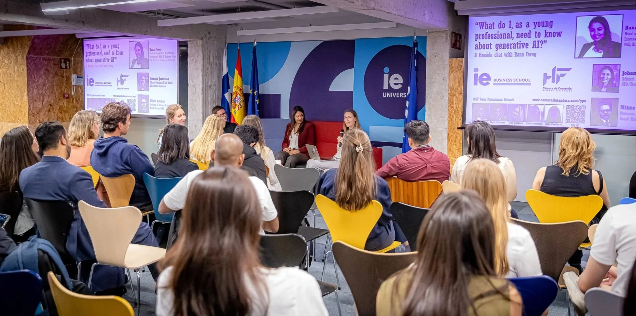 Last week, we hosted our second YPN event, dedicated to Generative AI and its implications for young professionals. The event offered an intriguing discussion on how artificial intelligence is shaping the future of work and what young professionals should take into consideration while using it. The session featured a fireside conversation moderated by Mikko Ketokivi, Professor of Operations Management & Organization Design at IE Business School, with expert insights from Dr. Rana Raouf Farag, PhD, MBA, Head of Google Cloud AI Architecture EMEA-S, who explored both the opportunities and the responsibilities that come with using AI technologies.